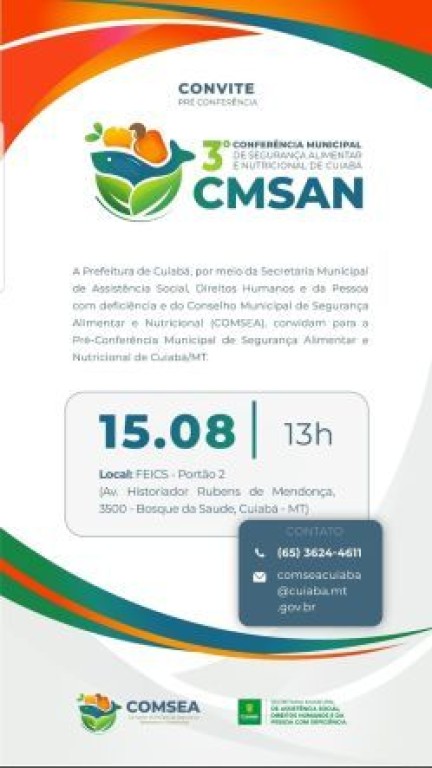 Será realizada nesta terça-feira (15), a partir das 13h, a Conferência Preparatória de Segurança Alimentar e Nutricional. A atividade será desenvolvida no auditório das Faculdades Evangélicas Integradas Cantares de Salomão (FEICS), Portão 2 (Anexo ao Grande Templo). Organizado pela Prefeitura de Cuiabá, por meio da Secretaria Municipal de Assistência Social, Direitos Humanos e da Pessoa