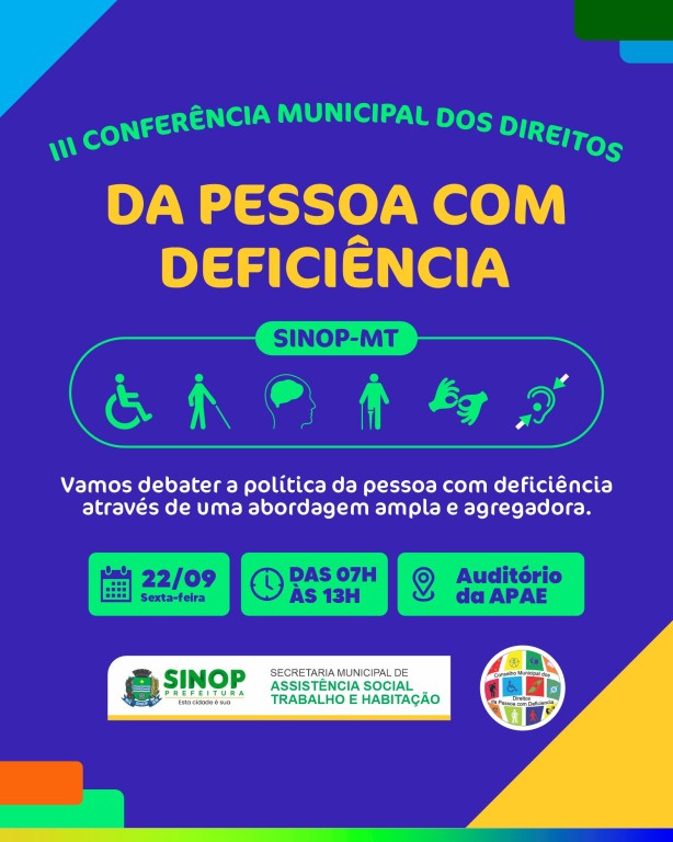 Prefeitura realiza III Conferência Municipal dos Direitos da Pessoa com Deficiência nesta sexta-feira (22) Com objetivo de debater os principais desafios e decidir prioridades para as políticas públicas relacionadas às pessoas com deficiência residentes no município, a Prefeitura de Sinop, por meio da Secretaria de Assistência Social, Trabalho e Habitação realiza, nesta sexta-feira (22), a