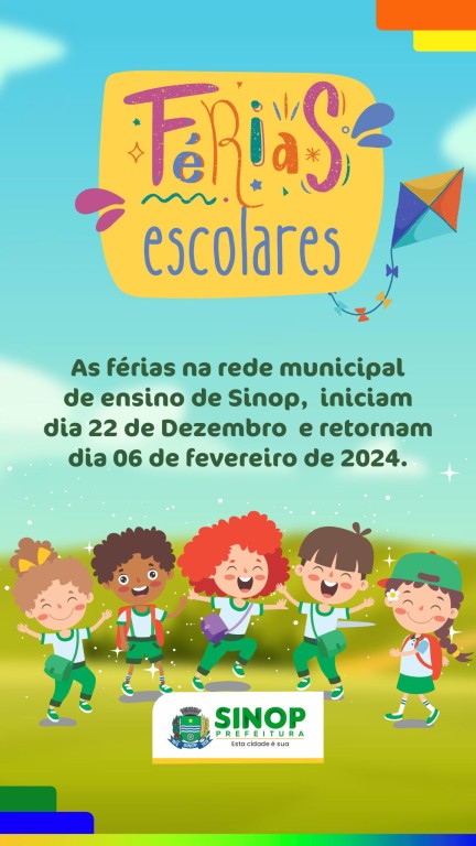 A Secretaria de Educação, Esporte e Cultura, informa que as férias escolares iniciam nesta sexta-feira (22), para os mais de 20 mil alunos das 42 unidades que atualmente integram a rede municipal de ensino de Sinop. No dia 6 de fevereiro começa oficialmente o ano letivo de 2024. Já os servidores dos setores administrativo, diretores