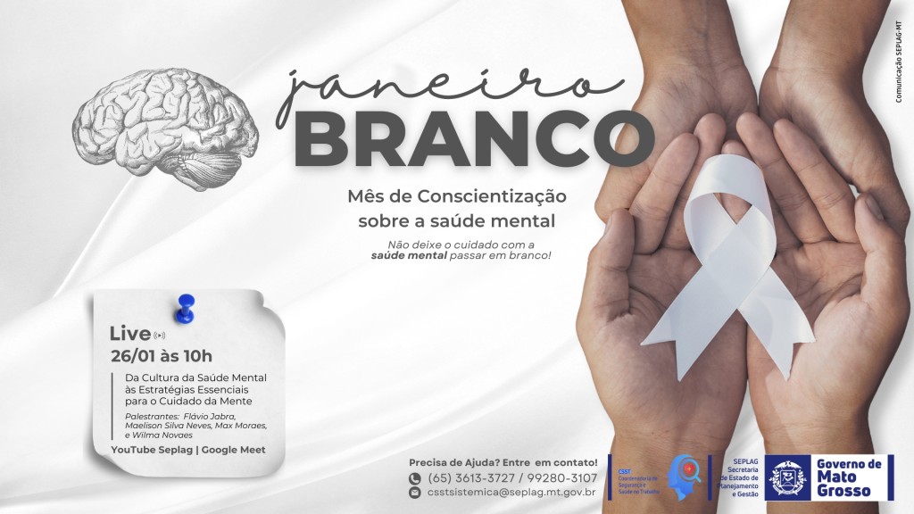 A Secretaria de Planejamento e Gestão (Seplag) realiza, nesta sexta-feira (26.01), uma live cujo tema é “Da cultura da saúde mental às estratégias essenciais para o cuidado com a mente”, por meio da Coordenadoria de Saúde e Segurança do Trabalho (CSST) em parceria com a Coordenadoria de Gestão de Saúde e Segurança no Trabalho (CGSST).