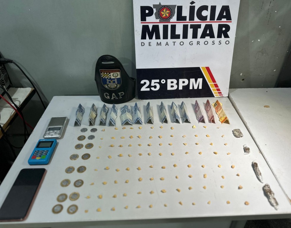Policiais militares do 25º Batalhão prenderam em flagrante, nesta segunda-feira (26.02), uma mulher, de 50 anos, por tráfico de drogas, no bairro Cristo Rei, em Várzea Grande. Com a suspeita, as equipes apreenderam 100 porções de entorpecentes, entre pasta base de cocaína e maconha, uma quantia em dinheiro, balança de precisão e uma máquina de