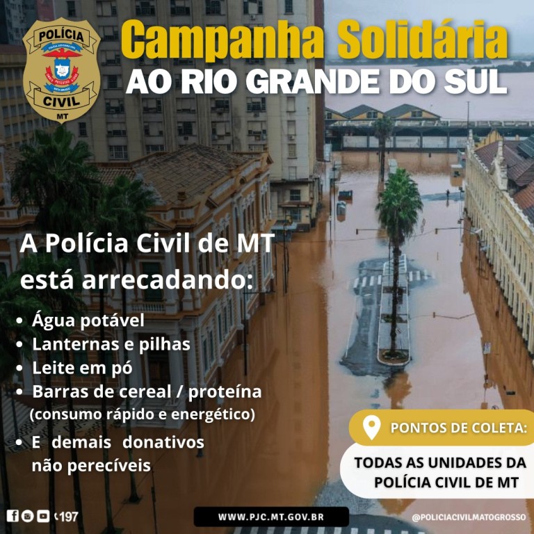 Em solidariedade a tragédia provocada pelas chuvas fortes no sul do país, a Polícia Civil de Mato Grosso realiza a “Campanha Solidária ao Rio Grande do Sul”. A ação visa arrecadar donativos não perecíveis, como água potável, leite em pó, barra de cereal, bolachas, lanternas, pilhas, roupas, entre outros itens que possam ajudar as famílias