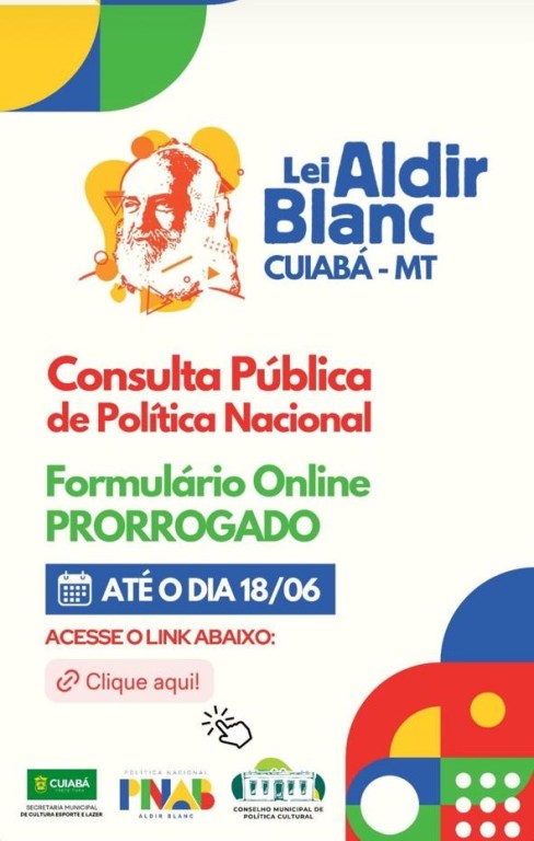 A Prefeitura de Cuiabá, por meio da Secretaria Municipal de Cultura, Esporte e Lazer, informa que o prazo para preenchimento do formulário de participação na Consulta Pública referente ao Plano Anual de Aplicação de Recursos da Lei Aldir Blanc (PAAR) 2024 foi prorrogado até o dia 18 de junho. Essa consulta está destinada à comunidade