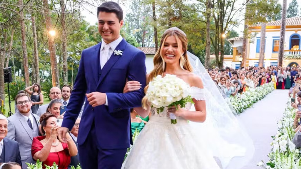 Júlia Vieira e Luigi César se casaram no final da tarde desta terça-feira (30), na Fazenda Santa Barbara, em Itatiba, interior de São Paulo, em uma cerimônia transmitida ao vivo no canal do YouTube da jovem, de 21 anos. Acompanhada por mais de 16,8 mil pessoas, a live começou com mais de duas horas de atraso devido à chuva