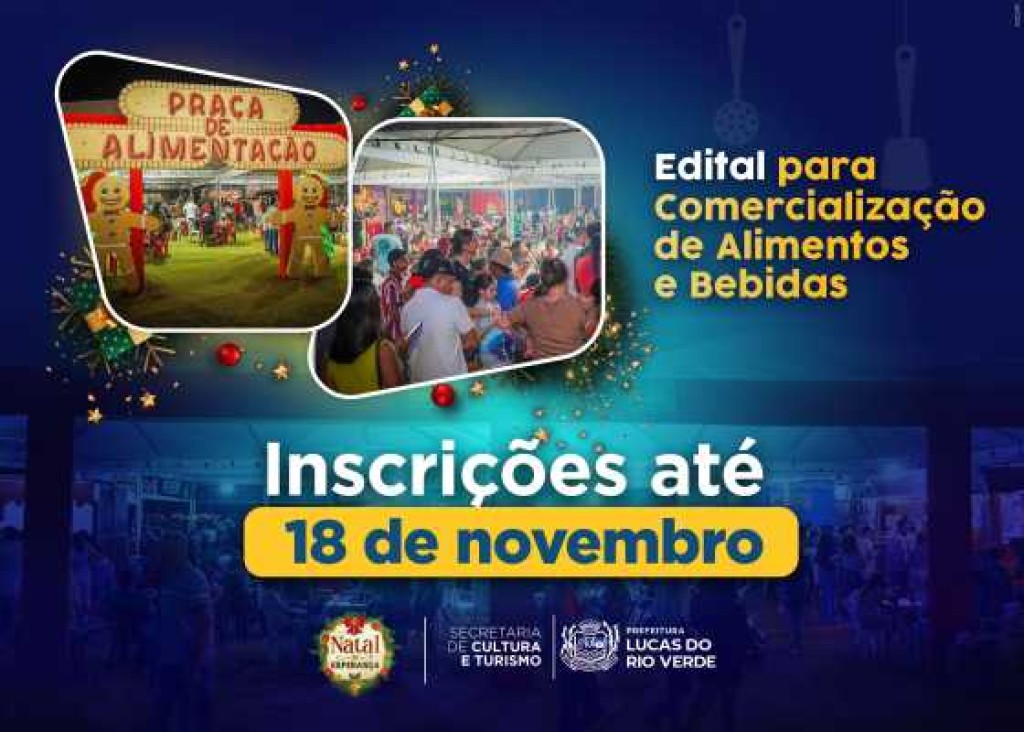 A partir desta sexta-feira (01), a Prefeitura de Lucas do Rio Verde, por meio da Secretaria de Cultura e Turismo, está com as inscrições abertas, do Edital de Seleção Nº 001/2024/SMCT, para seleção de empresas interessadas em comercializar alimentos e bebidas na praça de alimentação do “Natal da Esperança 2024”. As inscrições vão até o