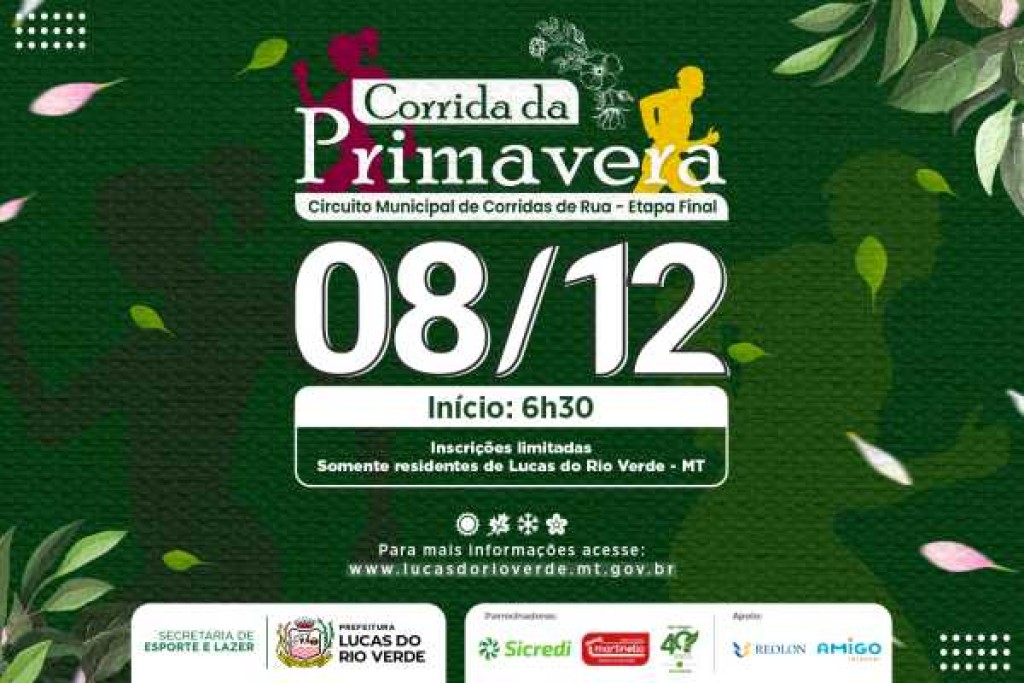 A partir desta quarta-feira (13), ao meio-dia, estarão abertas as inscrições para a quarta e última etapa do Circuito Municipal de Corridas de Rua de Lucas do Rio Verde. Os atletas que desejam participar da Corrida da Primavera devem garantir a vaga no seguinte endereço eletrônico: agitoesportes.com.br A prova acontecerá no dia 08 de dezembro,
