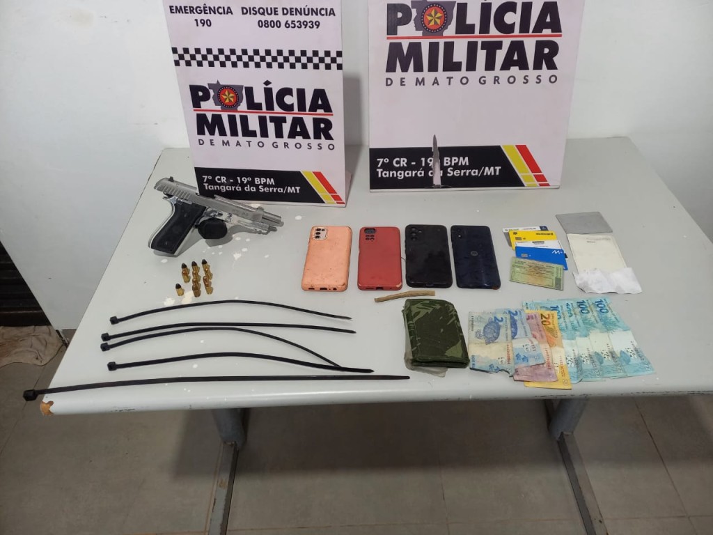 A Polícia Militar apreendeu em flagrante dois adolescentes, de 16 e 17 anos, por roubo a uma empresa de Tangará da Serra, na tarde desta terça-feira (17.12). Com a dupla, os policiais apreenderam uma pistola carregada com 12 munições. Por volta de 14h, as equipes policiais receberam denúncias sobre um roubo em andamento em uma