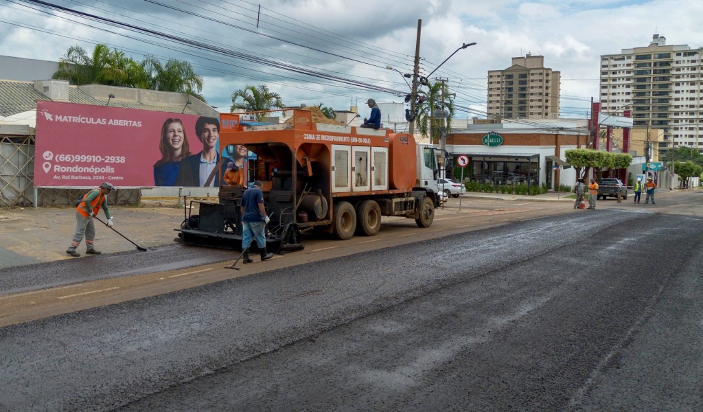 A Prefeitura de Rondonópolis deu início essa semana nos serviços de microrrevestimento asfáltico nas principais ruas e avenidas da cidade. A aplicação do material começou pela rua Dom Pedro II, no entroncamento com a avenida Lions Internacional, trecho que está interditado neste sábado (05). O trabalho é criterioso e para que possa alcançar o resultado