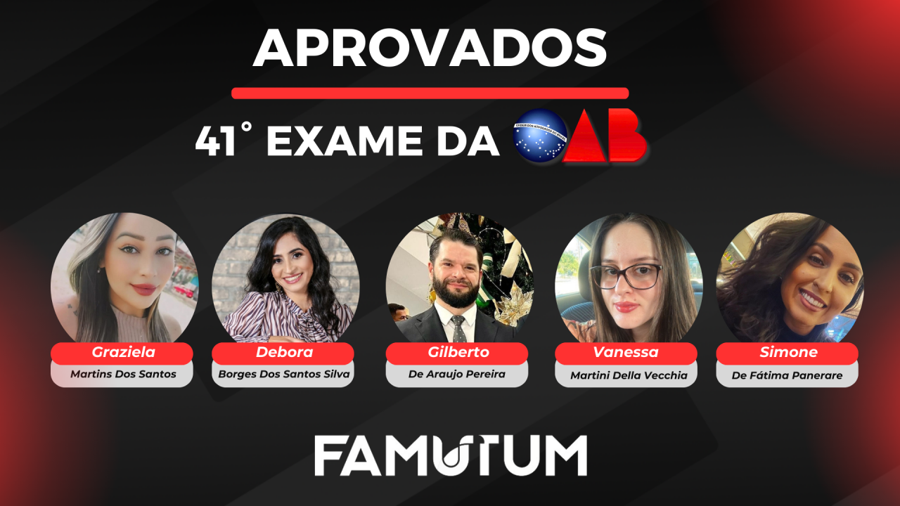 Na última semana foi divulgado o resultado do 41º Exame da Ordem dos Advogados do Brasil (OAB), cuja segunda etapa foi aplicada em 22 setembro de 2024. Do total de sete alunos da FAMUTUM + UPF que fizeram a prova, cinco alunos, do 9º semestre do curso de Direito, foram aprovados na primeira tentativa. Eles ainda estão em fase de conclusão do curso, que será finalizado no 10º semestre. São eles: Graziela Martins dos San-tos, Debora Camila Borges dos Santos Silva, Gilberto de Araujo Pereira, Vanessa Martini Della Vecchia e Simone de Fátima Panerare.