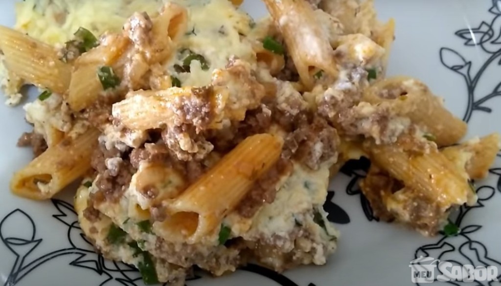 Ingredientes Óleo 1/2 cebola 3 dentes de alho 1/2 kg de carne moída 300 g de macarrão penne 340 g de molho de tomate 1 e 1/2 l de água Orégano Sal 1 colher de sopa de margarina 200 ml de leite Patê de ricota Queijo muçarela ralado Modo de preparo Em uma panela, coloque