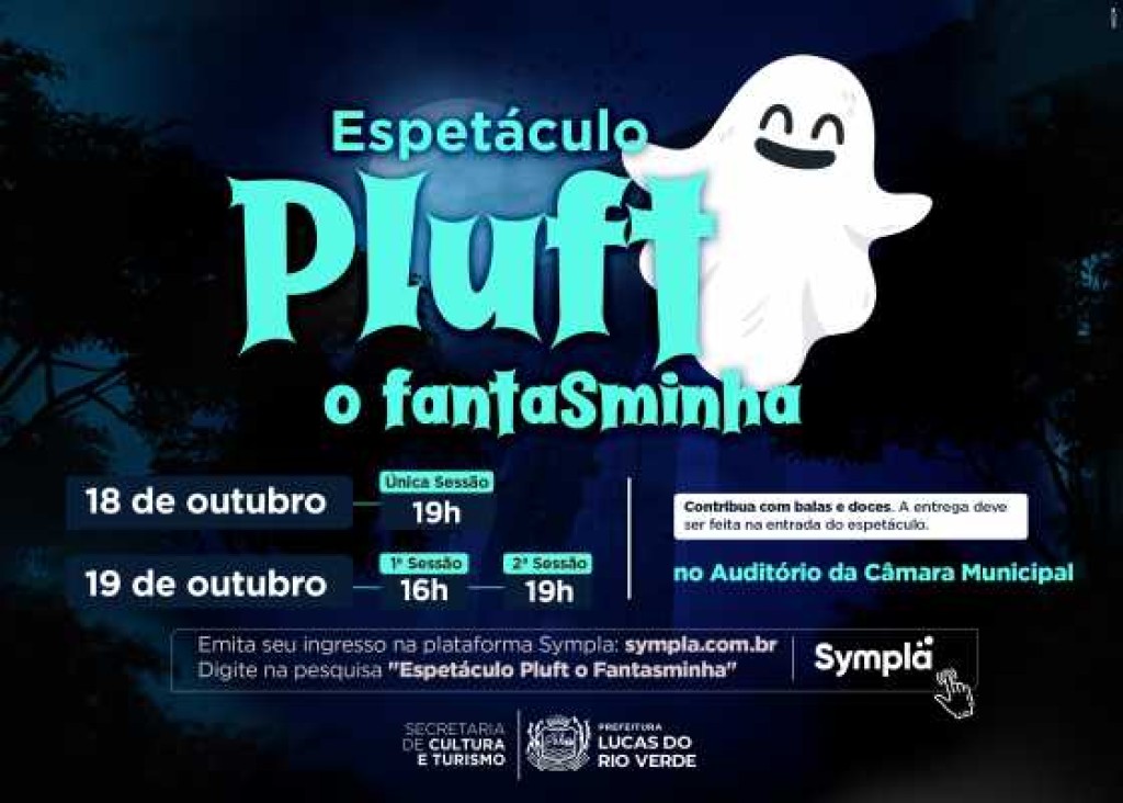 A Prefeitura de Lucas do Rio Verde, por meio da Secretaria de Cultura e Turismo, apresenta, nos dias 18 e 19 de outubro, sexta-feira e sábado, a peça teatral “Pluft, o fantasminha”. Gratuitas e abertas a população, as apresentações acontecem no Auditório da Câmara de Vereadores. Com temas voltados para amizade, coragem e aventura, a