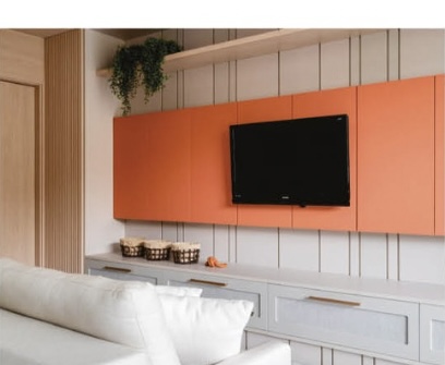 Na sala planejada, o vibrante detalhe de cor adiciona vida e personalidade a cada espaço, refletindo a energia e a alegria que compartilhamos em família.