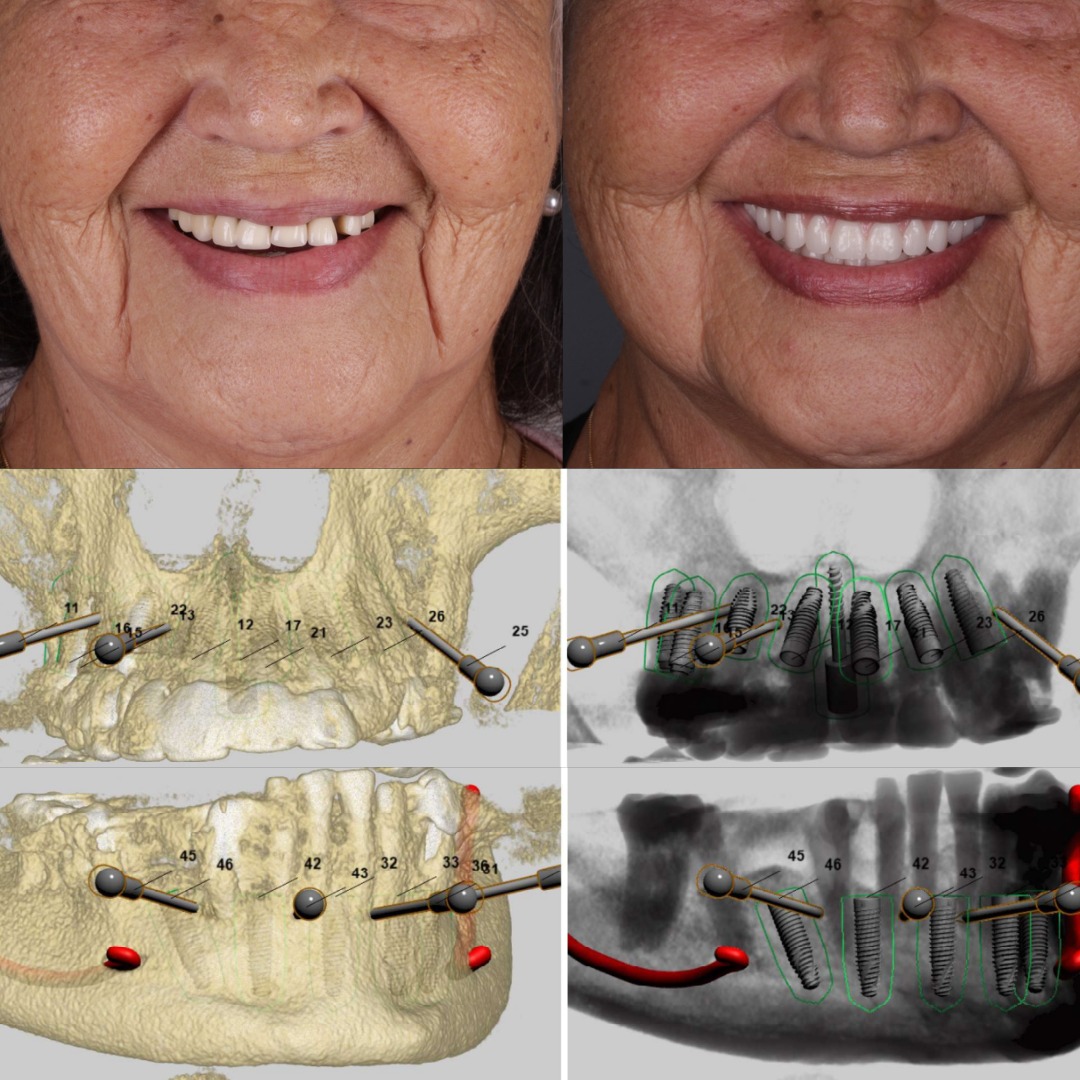 Durante o procedimento, foram removidos os dentes comprometidos e instalados seis implantes na arcada superior e cinco implantes na arcada inferior. No mesmo dia, a paciente já saiu com uma prótese provisória fixa sobre os implantes, recuperando imediatamente a estética do sorriso e a função mastigatória.