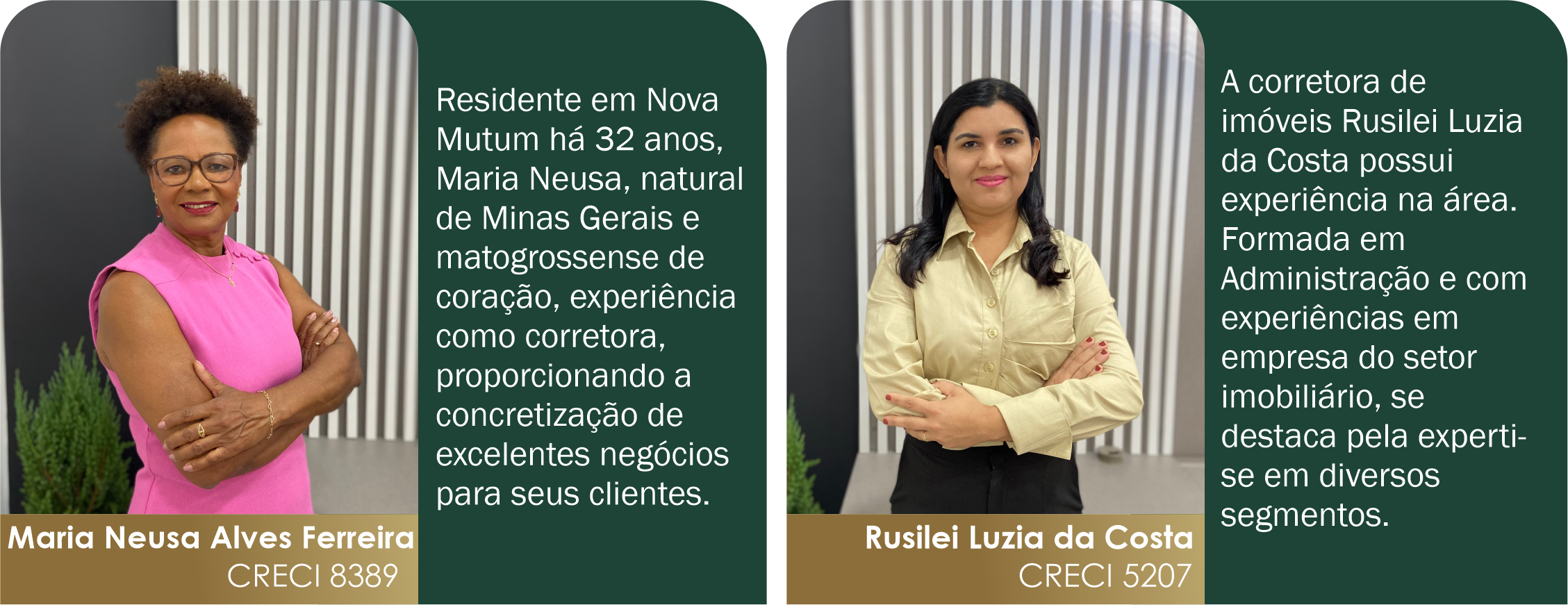 Integrando a equipe da Realize Imobiliária a Corretora de Imóveis Maria Neusa Alves Ferreira, CRECI 8389, e Rusilei Luzia da Costa, CRECI 5207.A REALIZE IMOBILIÁRIA reconhece a importância de cultivar relacionamentos sólidos. Sua abordagem transparente e íntegra possibilita que os clientes confiem para orientá-los com informações claras, facilitando a tomada de decisões informadas sobre seus investimentos imobiliários.